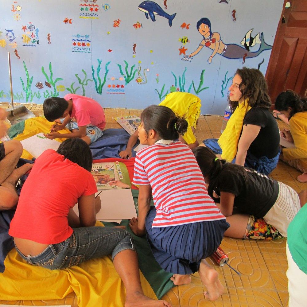 Afternoon: Arriving back at the hotel it was a relief to see all the luggage had already been loaded onto the buses. After quickly restocking on water we all piled back into the buses for the journey to our next destination, Takeo. By this time we were all exhausted and fell asleep fairly soon after our stop to the bakery. Despite the heat the scenery was wonderful, rice paddies and lotus fields lined with palm trees and the hills in the distance. The entire trip was about two hours and we had a warm welcome when we arrived. We rushed to find the best rooms and explore the balcony and veranda before rushing off again. Half of us went straight to the New Futures Orphanage while the rest of us went off in a Tuk Tuk to buy push bikes. They were assembled right in front of us and after fixing faulty brakes we set off to join the others at NFO.